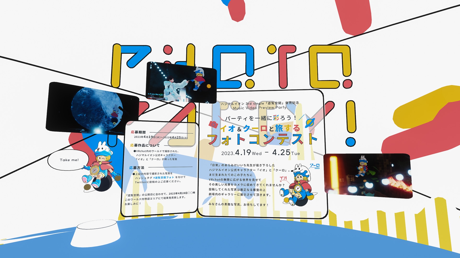 コンテスト期間中に「遊覧空間」リリース記念のオリジナルワールドを訪れていただきますと『あらゐけいいち先生』描き下ろし公式キャラクター「イオ」と「クーロ」のアバターデータが公開されていますので、来場されたみなさんがキャラクターに成り代わってVRChat内のさまざまな世界を旅しながら撮影していただき、その写真をTwitterに投稿していただく企画となっております。